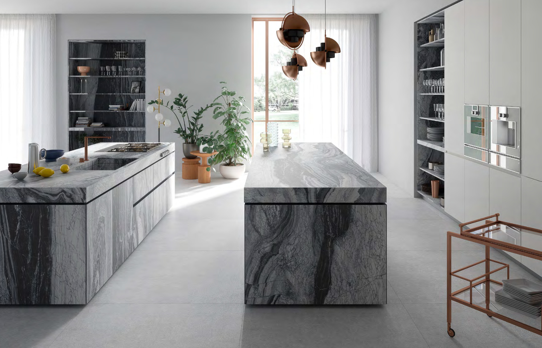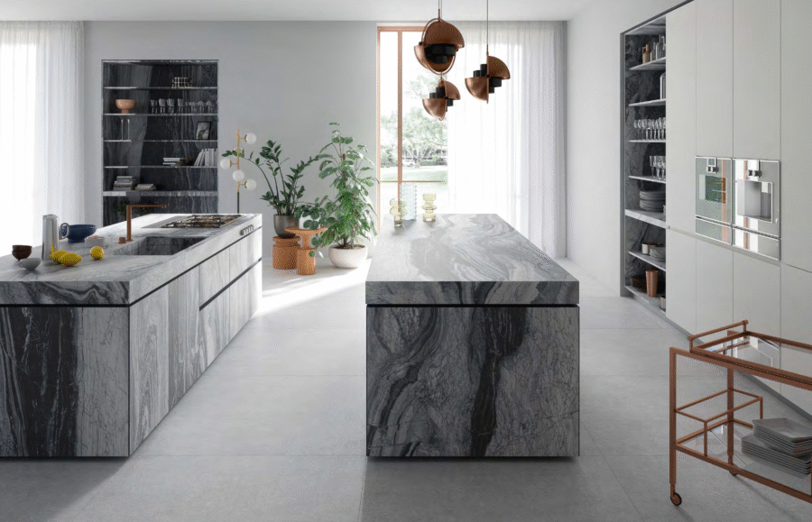 Đá nung kết Amano Marble – bề mặt vân xám “đương đại, liền khối, ít bảo trì”