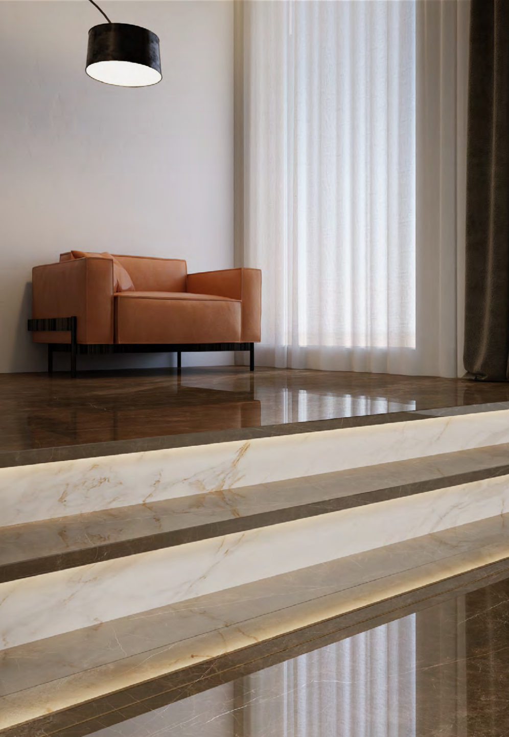 Đá nung kết Armani Umber đưa tông nâu umber – màu của gỗ cổ, của cacao rang – bước vào không gian hiện đại bằng một cách rất tinh tế: nền nâu trầm được “nâng tông” bởi mạch vân trắng khói mảnh, chạy chéo theo mảng lớn. Nhìn kỹ bức ảnh: bậc cấp lát Đá nung kết Armani Umber Polished cho bề mặt bóng sâu, phản chiếu đèn hắt dưới mũi bậc; sofa da caramel và rèm sheer trắng kem làm nổi phần nền nâu – một phối cảnh quiet luxury đậm hơi thở khách sạn 5*. Ở tường và sàn cùng tông, Đá nung kết Armani Umber tạo hiệu ứng “khối – nền” đồng bộ, khiến căn phòng vừa ấm vừa sang.