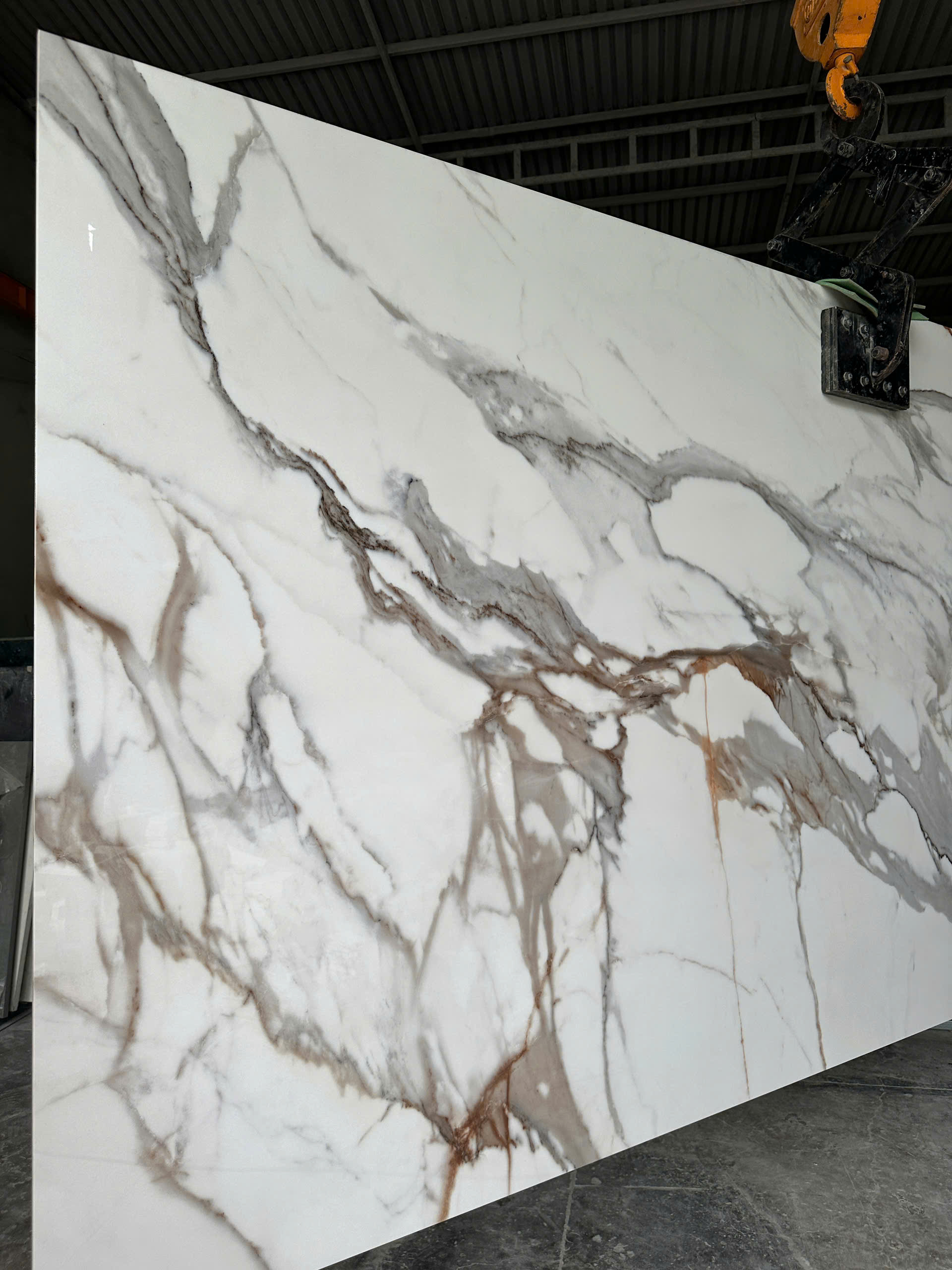 Vân xám ấm xen vệt vàng/amber – nhấn mạnh tính “Italian classic”.