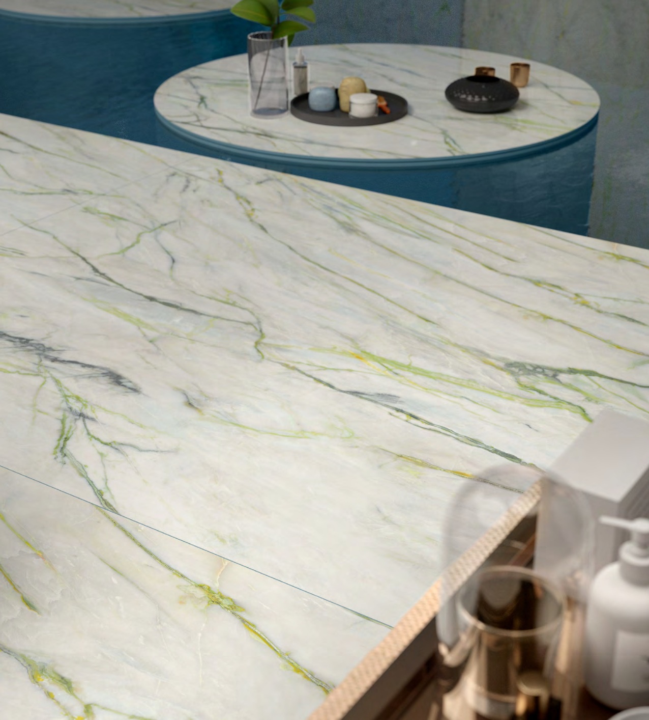 Khác với marble tự nhiên, bề mặt nung kết được nén – nung ở nhiệt độ rất cao, hình thành tấm đồng nhất, gần như không thấm, chịu nhiệt/UV, bền bỉ trong vận hành thực tế. Điều đó giúp Calacatta Green vừa đẹp như ảnh render, vừa dễ sống mỗi ngày.