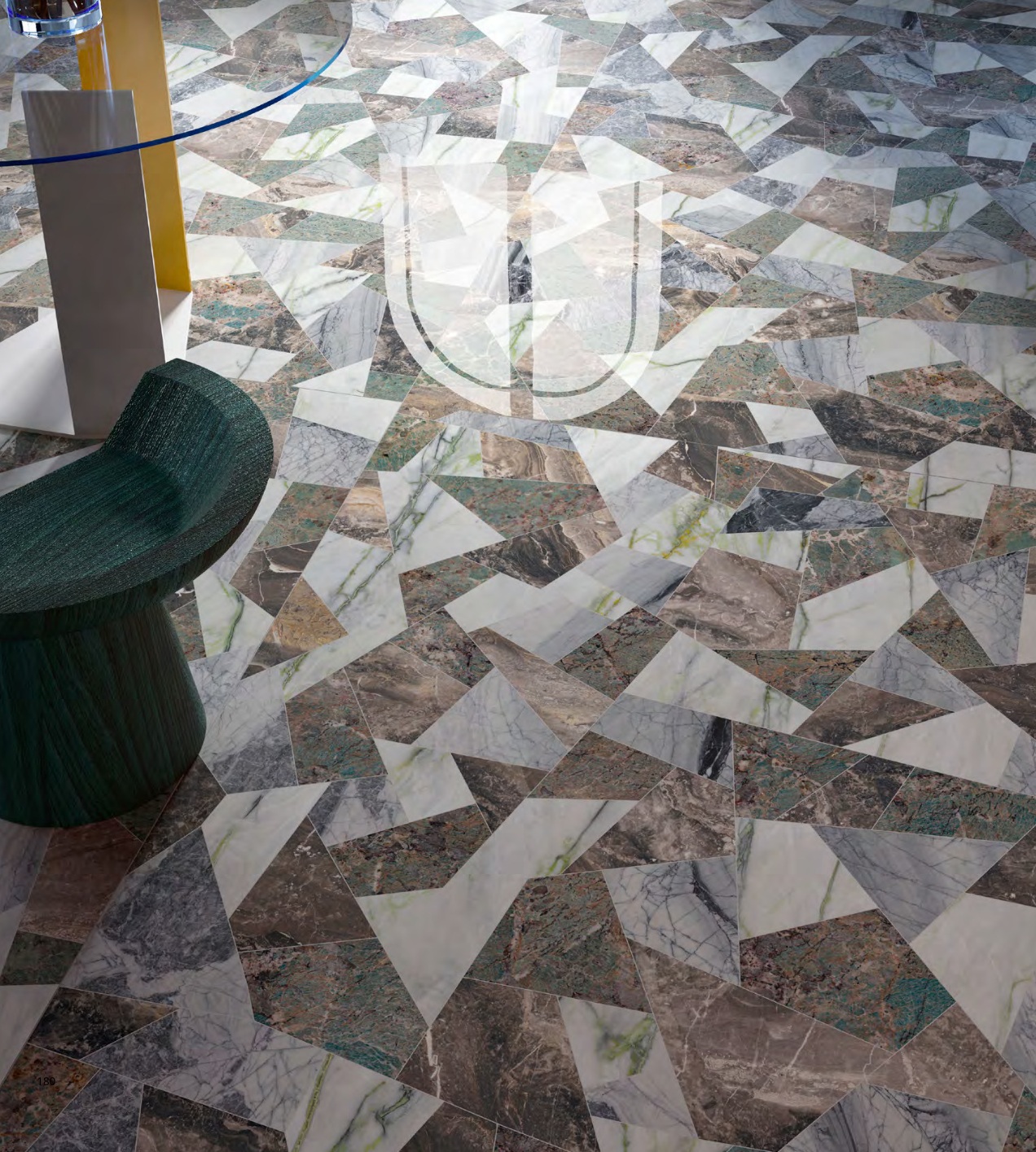 Họa tiết/vân Crazy-paving multimarble – mảnh ghép màu xanh lục/xám/trắng/nâu