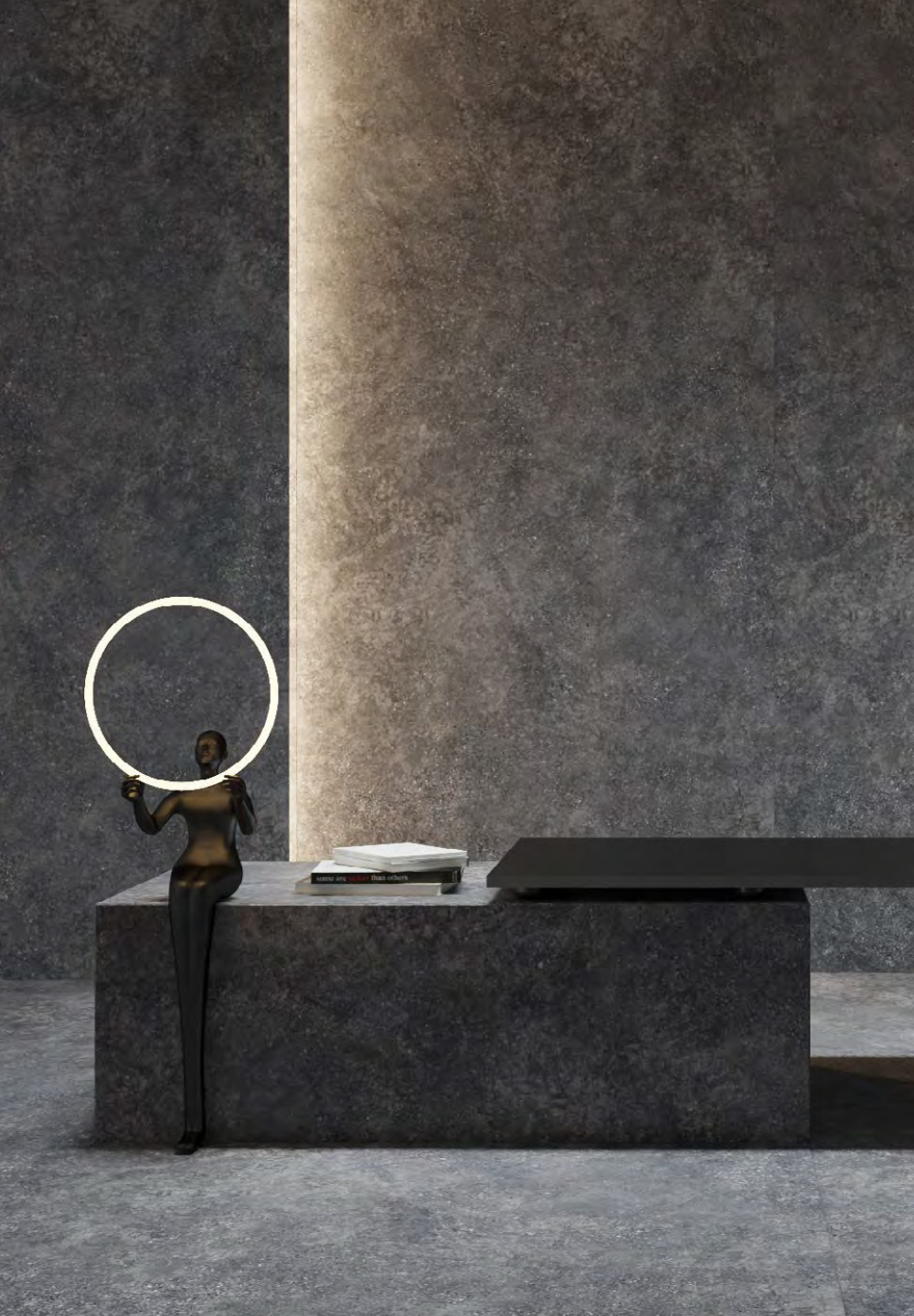 Đá nung kết Gravel Stone được phát triển cho những không gian ưa phong cách modern–minimal: sắc xám sỏi đậm (gravel grey) với texture hạt khoáng dày giống nền đá tự nhiên bị gió cát bào mịn trong hẻm núi. Nhìn vào hình thực tế: mảng tường–sàn Đá nung kết Gravel Stone tạo nền xám đồng nhất; đường sáng đèn hắt dọc làm nổi độ sâu bề mặt; khối bàn quầy cùng vật liệu cho cảm giác monolithic (một khối). Phiên bản Polished phản chiếu mềm, Matte/Honed cho bề mặt mịn – “ăn ánh sáng” vừa đủ, hợp studio, lobby, quầy lễ tân, bếp quầy bar, phòng vệ sinh khô và cả các bề mặt nội thất tông tối.