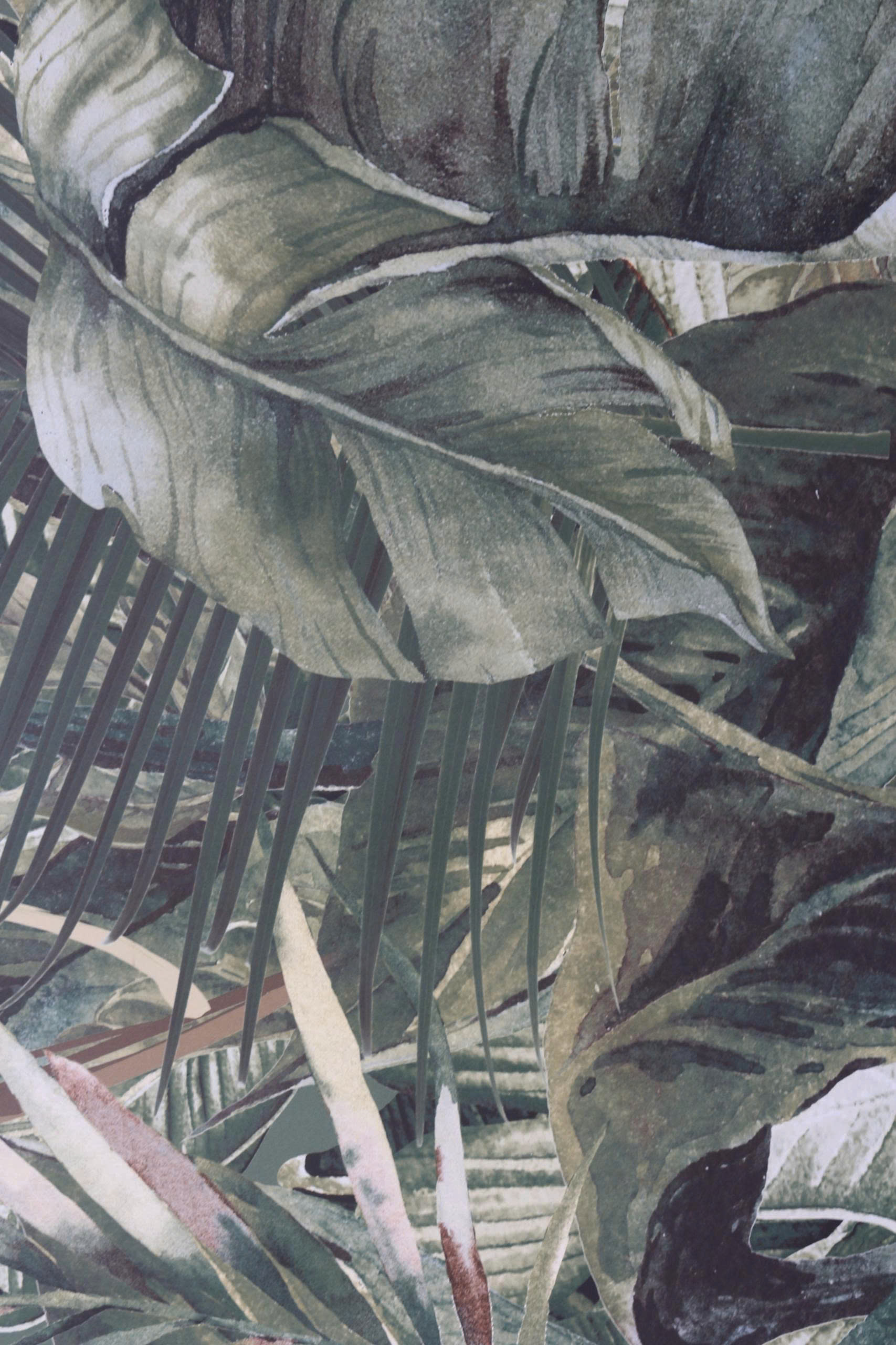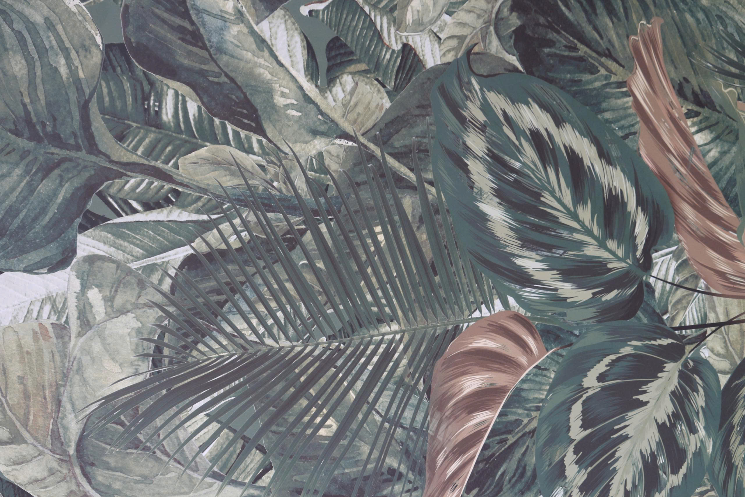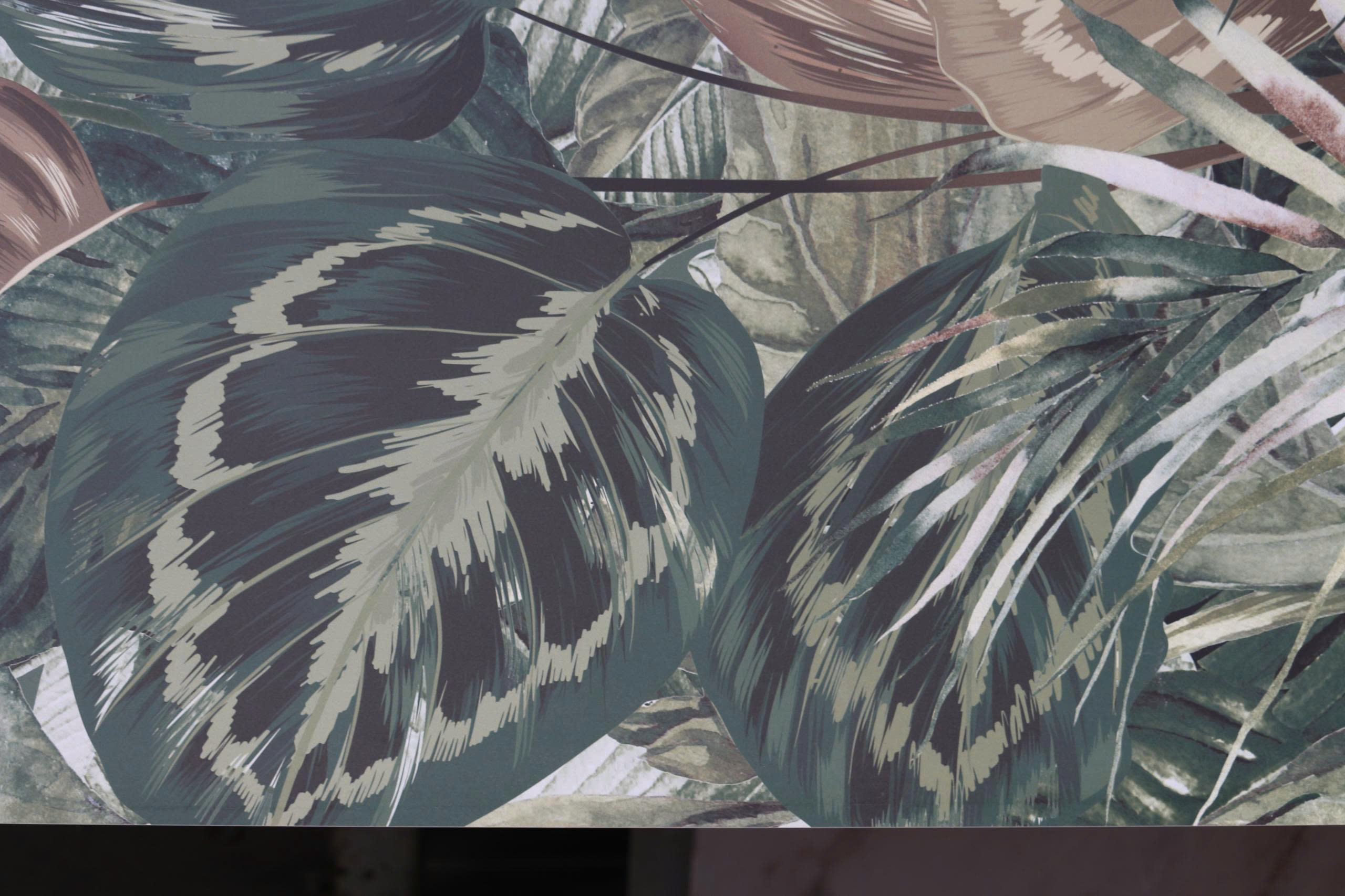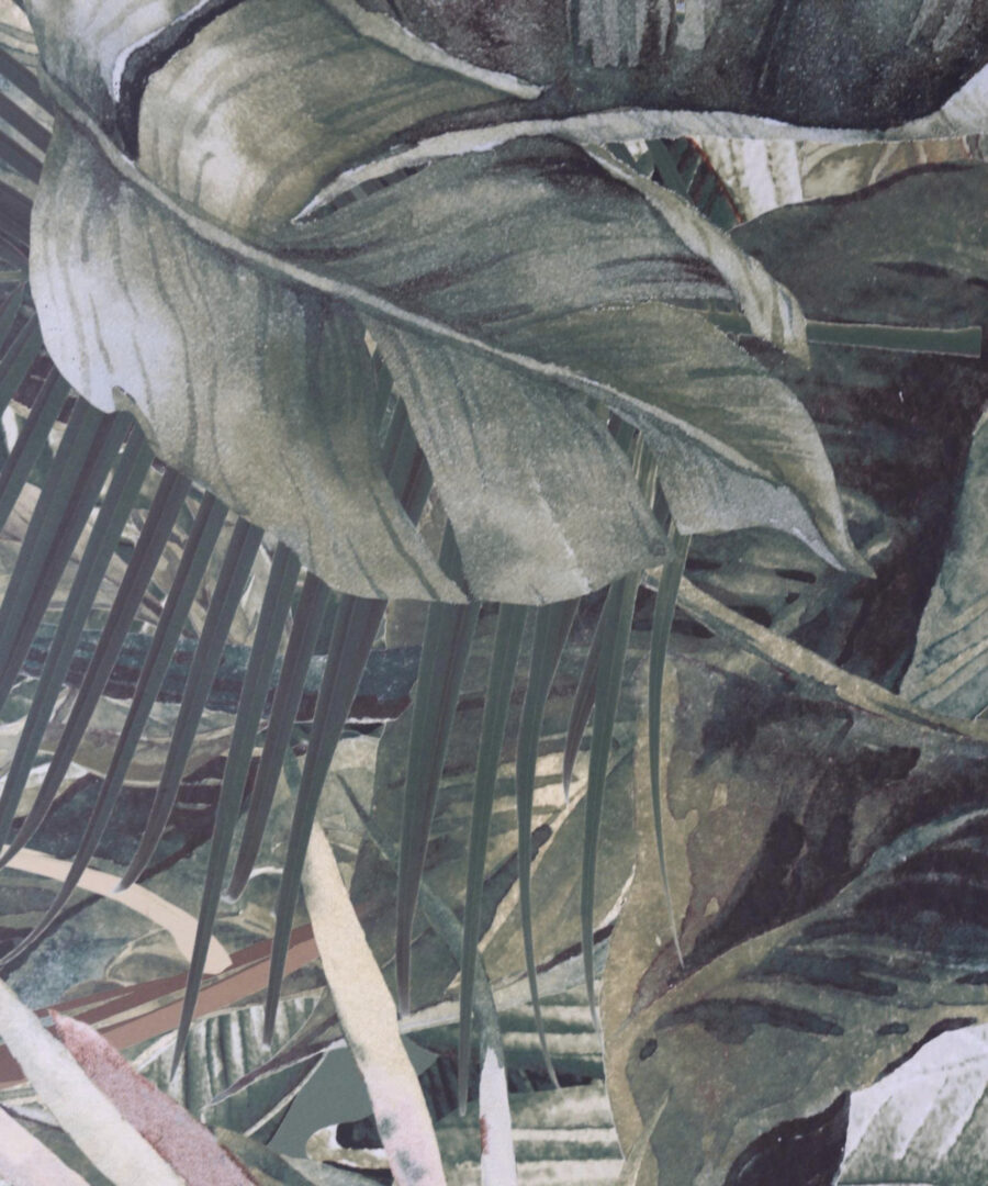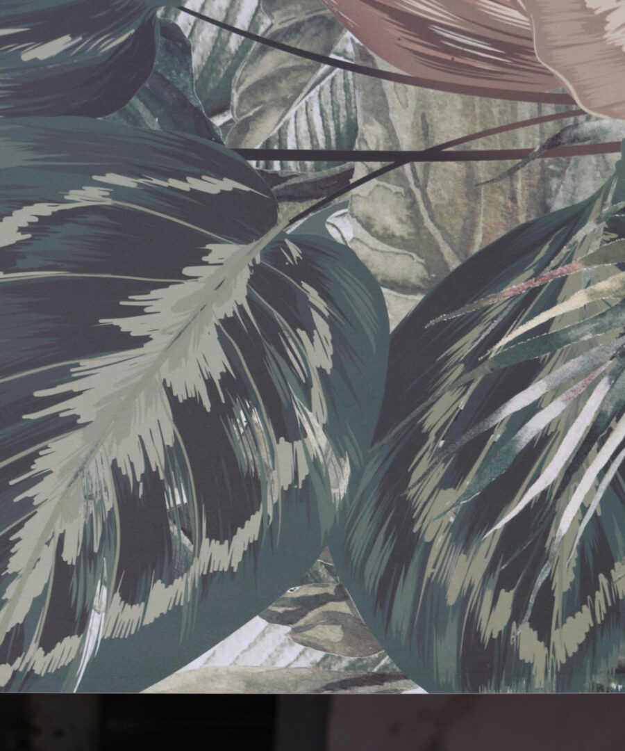 Tông cảm xúc: xanh lá nhiều lớp (deep green), đan kẽ be – nâu của thân/cành, độ sâu hình ảnh cao, cho cảm giác biophilic (đưa thiên nhiên vào không gian). Khi phối với gỗ ấm, kim loại champagne, vải linen, bề mặt trở nên sang trọng và “ấm – sống” thay vì chỉ là mảng tường phẳng.