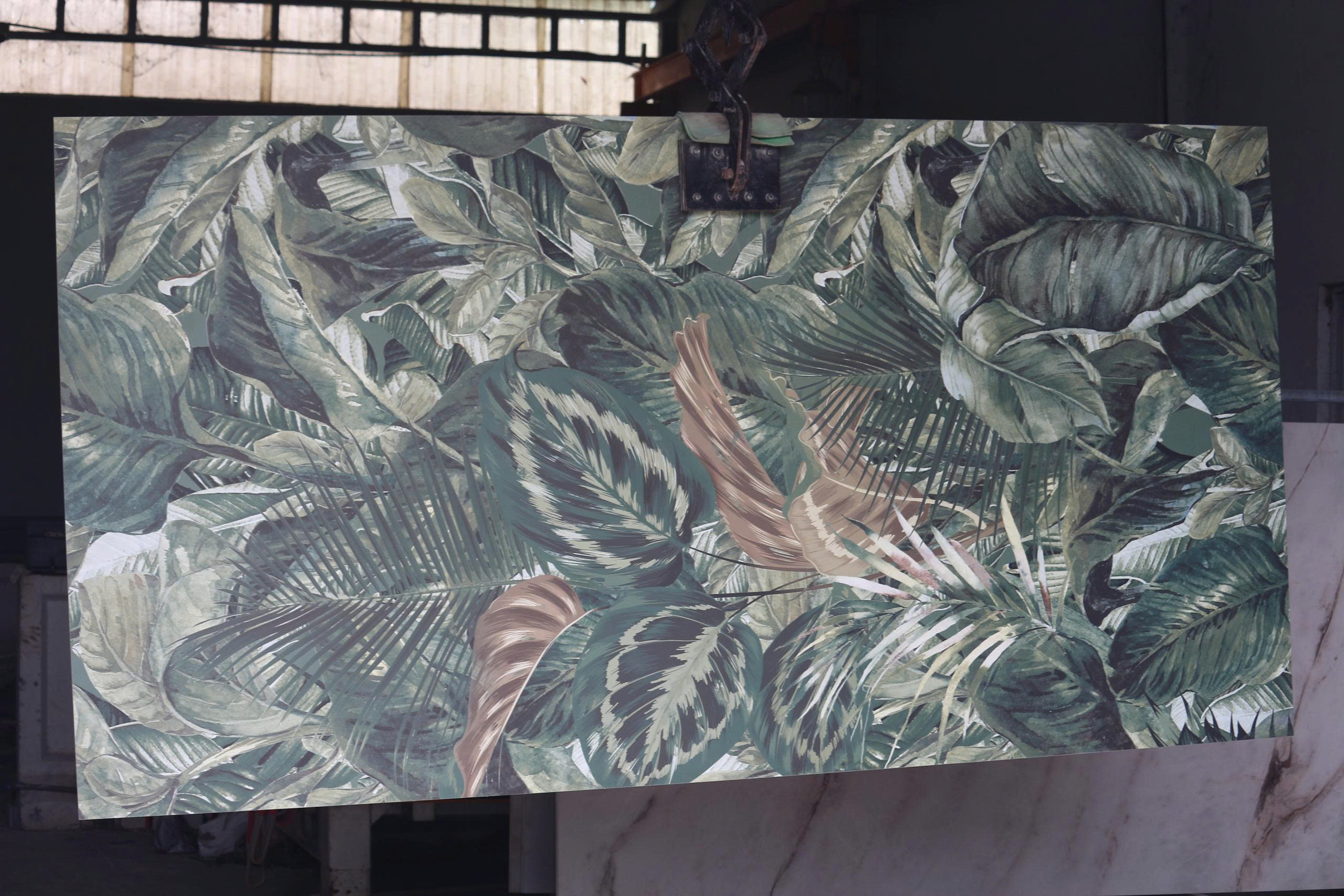 Jungle Green Deep là mẫu đá nung kết (sintered stone) trang trí “mural” với họa tiết lá rừng nhiệt đới được in – nung trực tiếp trên bề mặt tấm. Không giống giấy dán tường hoặc tranh decal, hoa văn được cố định bằng quy trình nén & nung ở nhiệt độ rất cao, tạo nên lớp mặt bền màu – chống trầy – kháng ẩm. Kết quả là một “bức tường sống” xanh mát nhưng dễ bảo trì, phù hợp từ nhà ở đến hospitality (spa, resort, café, boutique, lobby khách sạn).