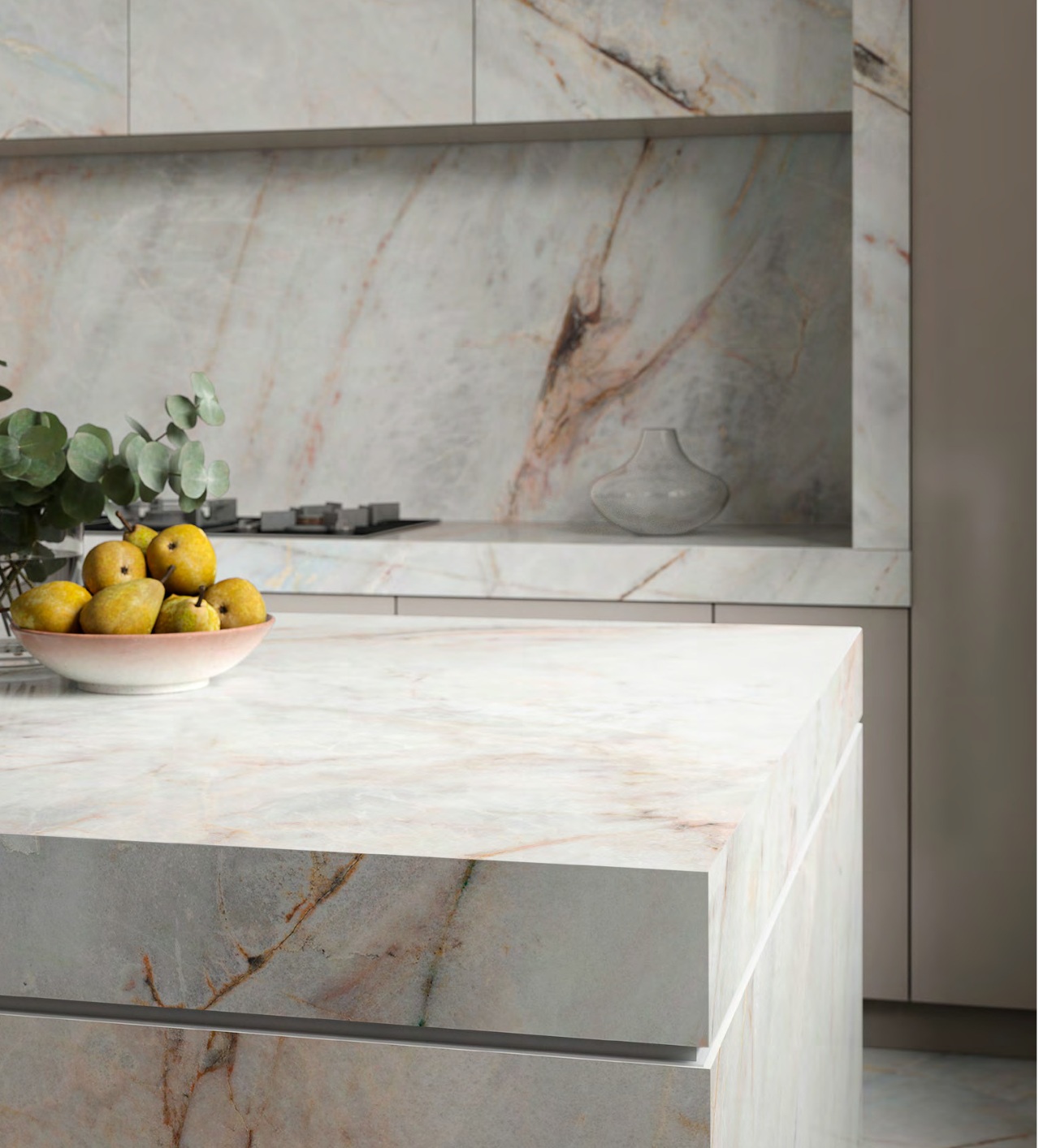 Đá nung kết Monte Bianco lấy cảm hứng từ cẩm thạch Ý sáng màu, nền trắng khói pha chút ngà rất “clean”, đan cài vân caramel – hổ phách – xám be kéo dài mạch mẽ, tạo cảm giác ấm áp nhưng vẫn tối giản – sang trọng. Ở không gian bếp trong ảnh minh họa, Monte Bianco cho bề mặt sáng – rộng – dịu mắt, khi phối với gỗ ấm, kim loại champagne và rèm dệt nhẹ, tổng thể đạt cảm giác residential luxury đúng xu hướng.