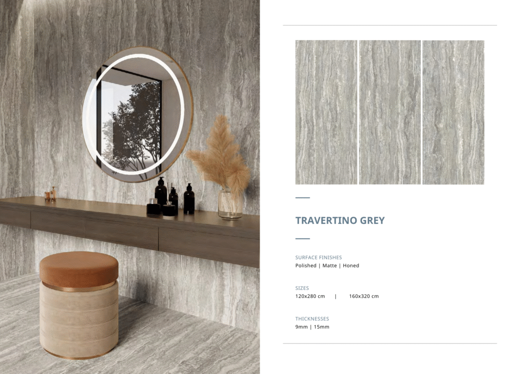 Đá nung kết Travertino Grey – gam xám thanh lịch, biểu tượng của sự tinh tế và đẳng cấp trong thiết kế hiện đại.